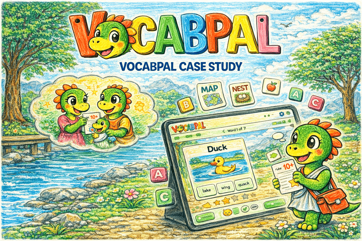 I designed a baseline assessment structured around a 5-stage reading progression — from pre-emergent sound awareness (Stage 0) through word reading, sentence fluency, paragraph comprehension, to inference and expression (Stage 4). Each stage maps to a specific instructional need, so the teacher doesn't just get a score — she gets a clear next step for each student. The baseline test is 10 questions, 2 per stage, mixing recognition tasks (MCQ, audio matching) with production tasks (typing dictated words). As a student answers correctly, the difficulty increases. Two consecutive wrong answers ends the test — the app has found their ceiling. A scoring matrix assigns each student to a stage with a corresponding instructional need. The student experience was designed for the constraints of these classrooms: 1. Child-friendly UI where every tap, every response, is reinforced with visual and audio cues. Text-to-speech uses a natural female Indian English voice so pronunciation matches what students hear in class. Gamification through star collection — one star per correct answer — with micro-animations that make progress feel tangible. Pacing that feels natural, not rushed. The app was designed to run on older tablets with limited connectivity. 2. Some students found the visual design so engaging that they started drawing their own versions of the characters. Others described it as feeling like a game. Not one student in the Phase 1 test skipped any of the work. The teacher dashboard surfaces what was previously invisible: Students grouped by reading stage across classes and sections. Average scores per class with drill-down into individual attempts. Time-per-question data that reveals not just correctness but confidence: two students might both answer correctly, but one taking 13 seconds and the other taking 1 second tells the teacher something different about their readiness. Question-level breakdown showing result, time, and answer for each item. For the first time, the teacher can look at her class and see exactly which students need phonics work, which need sentence fluency practice, and which are ready for inference-level challenges.