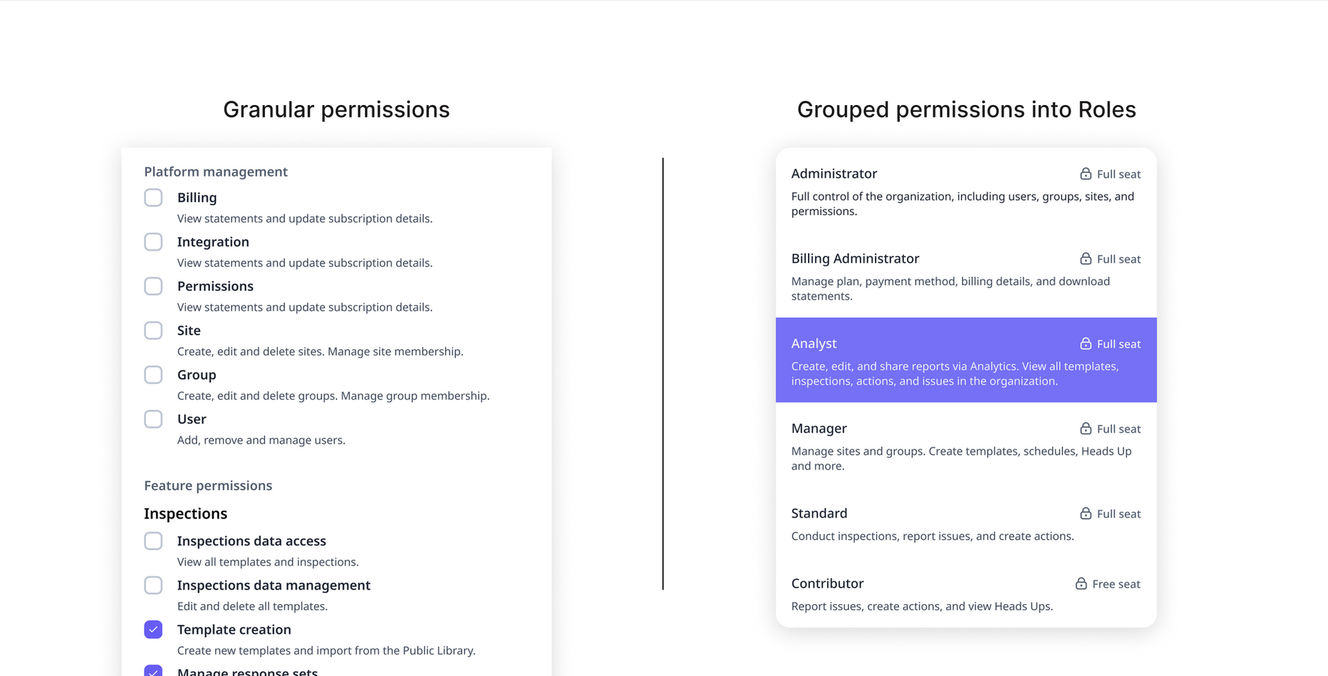 Permissions grouped into reusable Roles